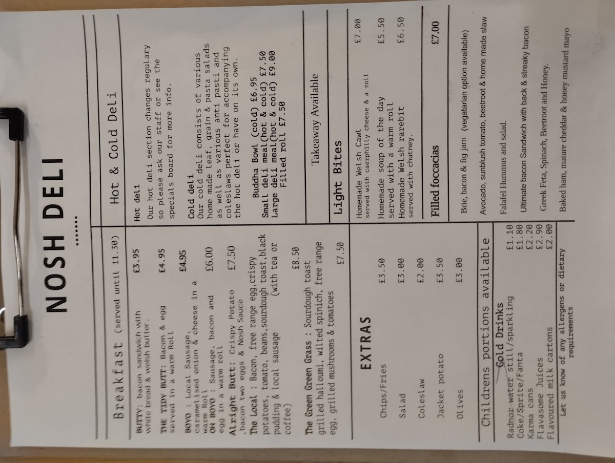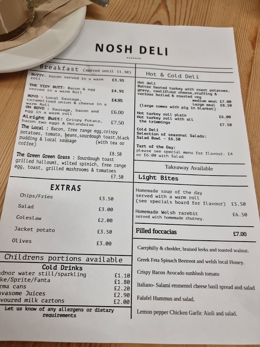 Welcome to Nosh Deli, a charming café nestled in the heart of Abergavenny's Butter Market. Offering a delightful selection of dishes, Nosh Deli is the perfect spot for breakfast or a light bite. Start your day with one of their unique butties, like the 'Tidy Butt' or the 'Green Green Grass,' all made with fresh, local ingredients.